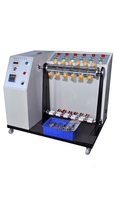 本试验机符合UL817等有关标准“软线组件和电源软线通用安全要求”的规定。适用于有关生产厂家和质检部门对电源线、DC线进行弯曲试验。本机可以测试插头引线及电线耐折强度,是将试品固定于夹具后施重,经弯曲到预定次数后,检测其断线率,或无法通电时机台自动停机,检视其总计弯曲次数。